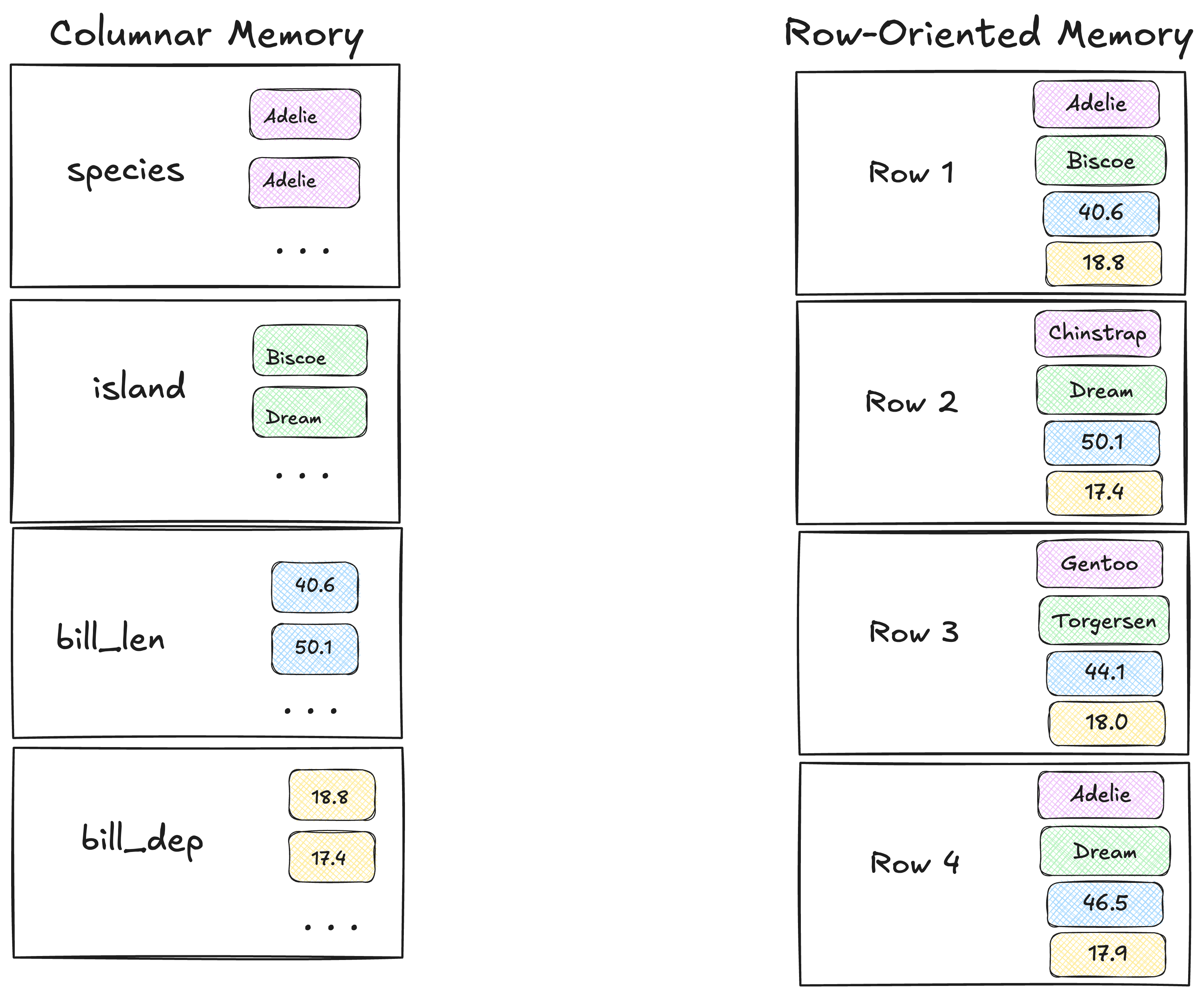 Instead, Apache Arrow is a columnar data format. Instead of each row being represented in memory, we have each column. This is a huge enhancement particularly for analytical processes where we are working with columns of data instead of _rows.
