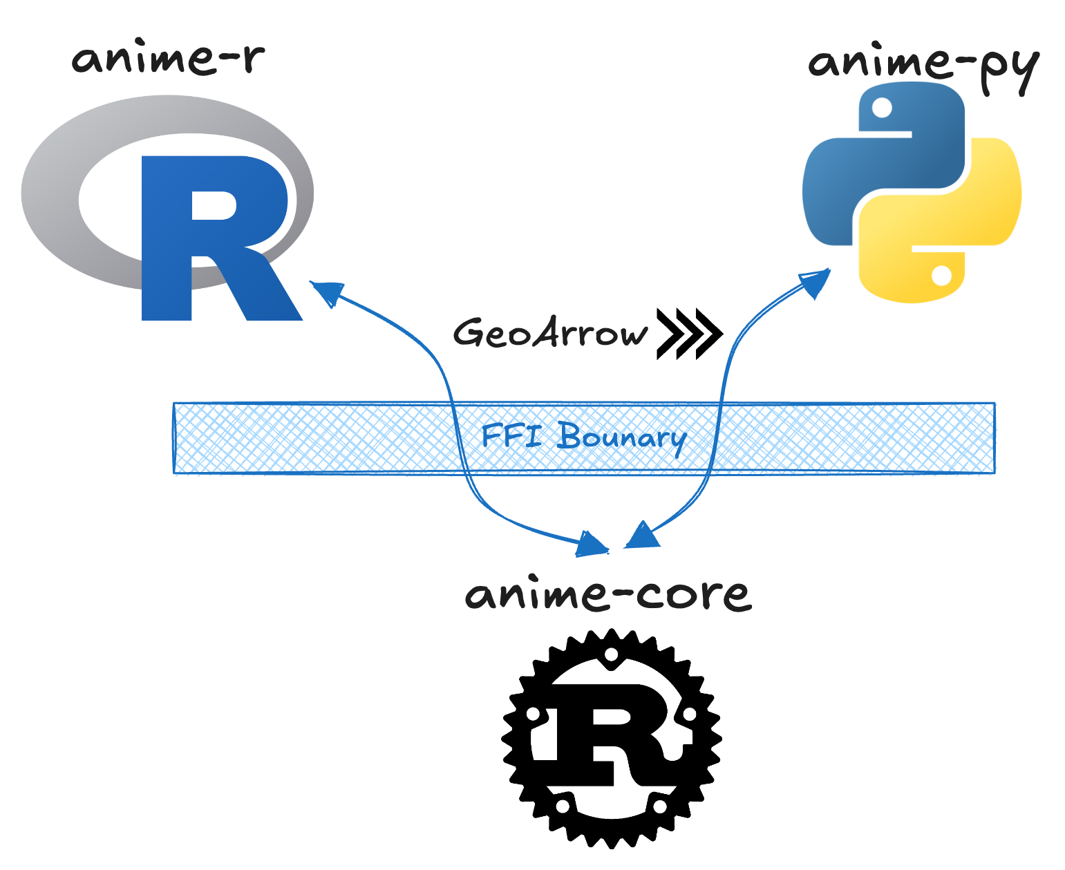 ANIME is not a perfectly fleshed out example. At present, the core rust library does not return Arrow but it is designed to work with the geoarrow-rust library. The current bindings are a loose-ish coupling approach where on the extendr and PyO3 side the results are processed into a data.frame and Arrow Table respectively.