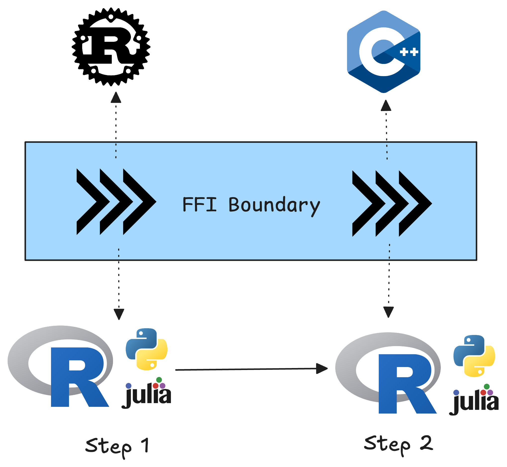At step 1, we may call a library that uses Rust under the hood. But when we send data to it, it uses Apache Arrow, and it also gives us back Arrow. Then in the next step, we use our Arrow data to call out to a C++ library which also accepts and returns Arrow.