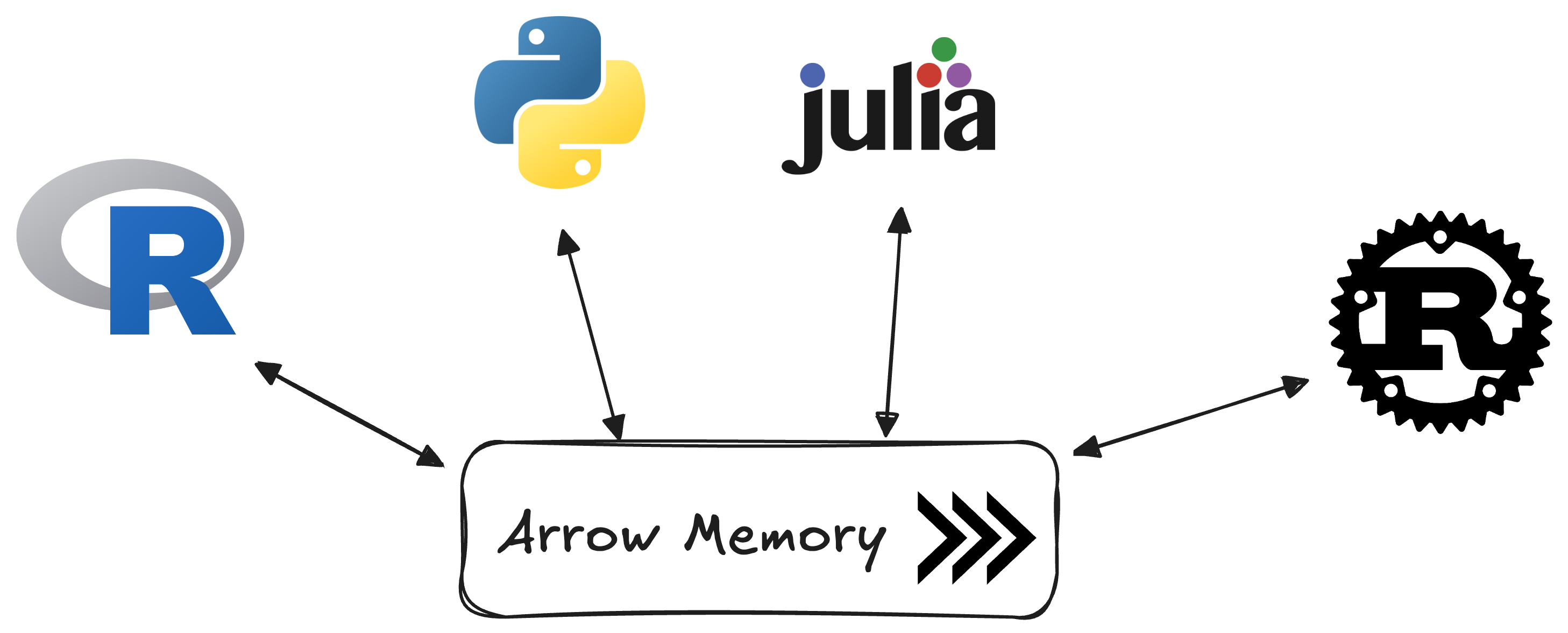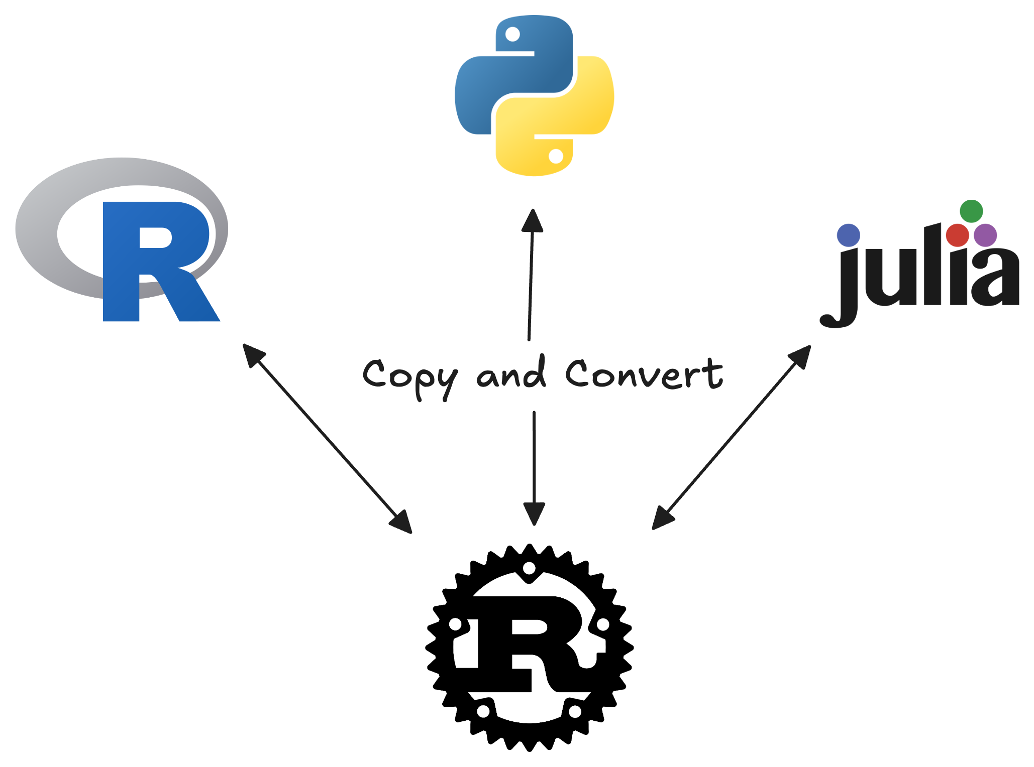 In this status-quo of cross-language tooling, we have this issue where data in R is represented differently than data is represented in Python, which is represented differently in Rust or Julia—and so on.