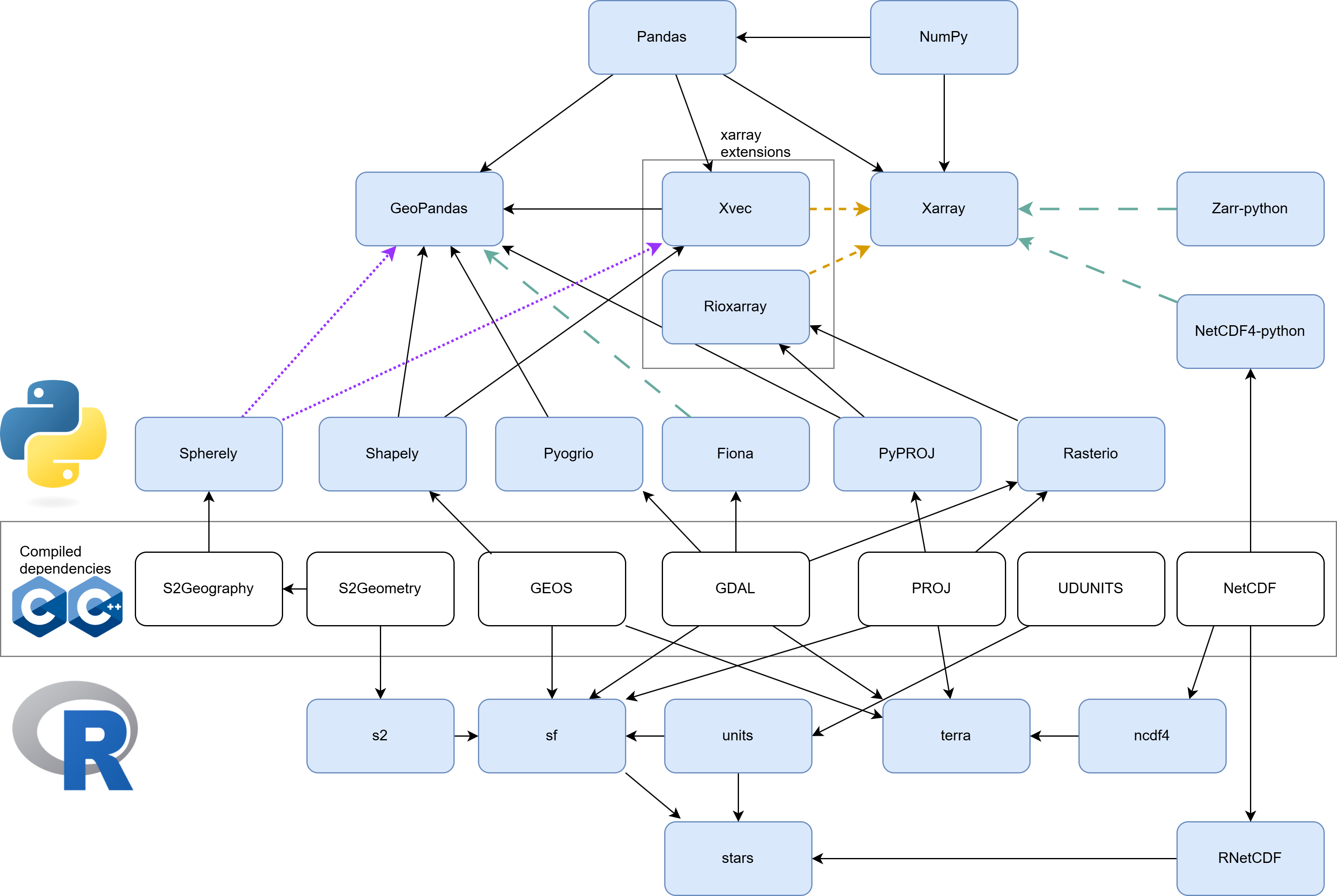 Core libraries such as GEOS, GDAL, and PROJ are written in C/++ with bindings to them in R, Python, Julia, and others.